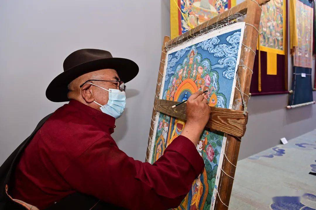 图为传统唐卡画师在现场作画。记者 旦增西旦 摄