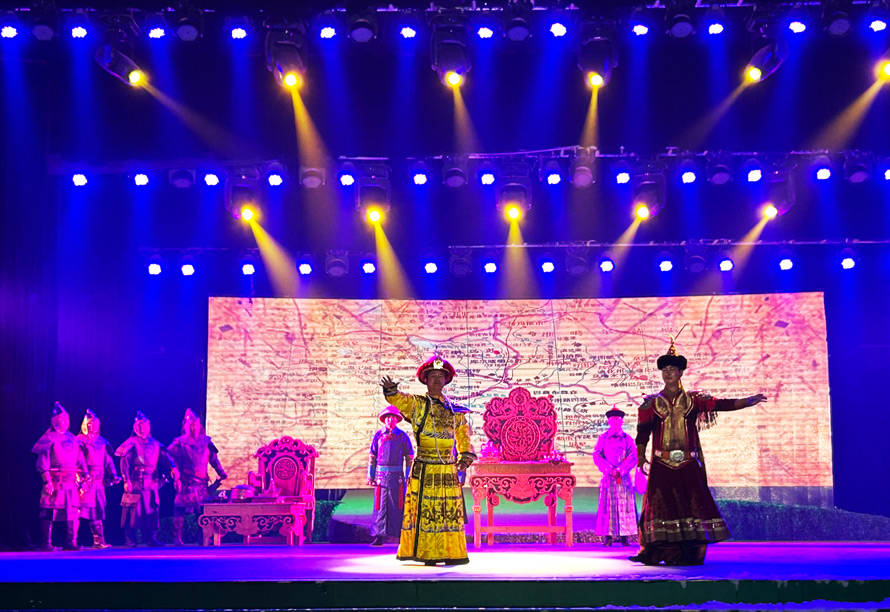 在巴音布鲁克镇,一场《东归印象》实景剧演出,赢得场下采风团的阵阵掌声。该剧生动还原了1771年,蒙古族土尔扈特首领渥巴锡率部历经千难万阻回归祖国怀抱的英雄壮举,以歌舞的形式展现土尔扈特人对祖国赤诚的热爱,传扬蒙古族土尔扈特部落的东归文化。