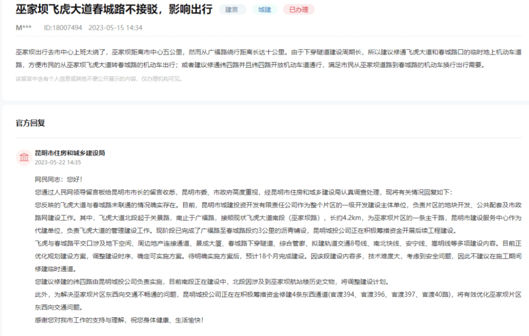 有网友通过地方领导留言板反馈巫家坝飞虎大道、春城路不接驳影响出行,希望提供方便通道。