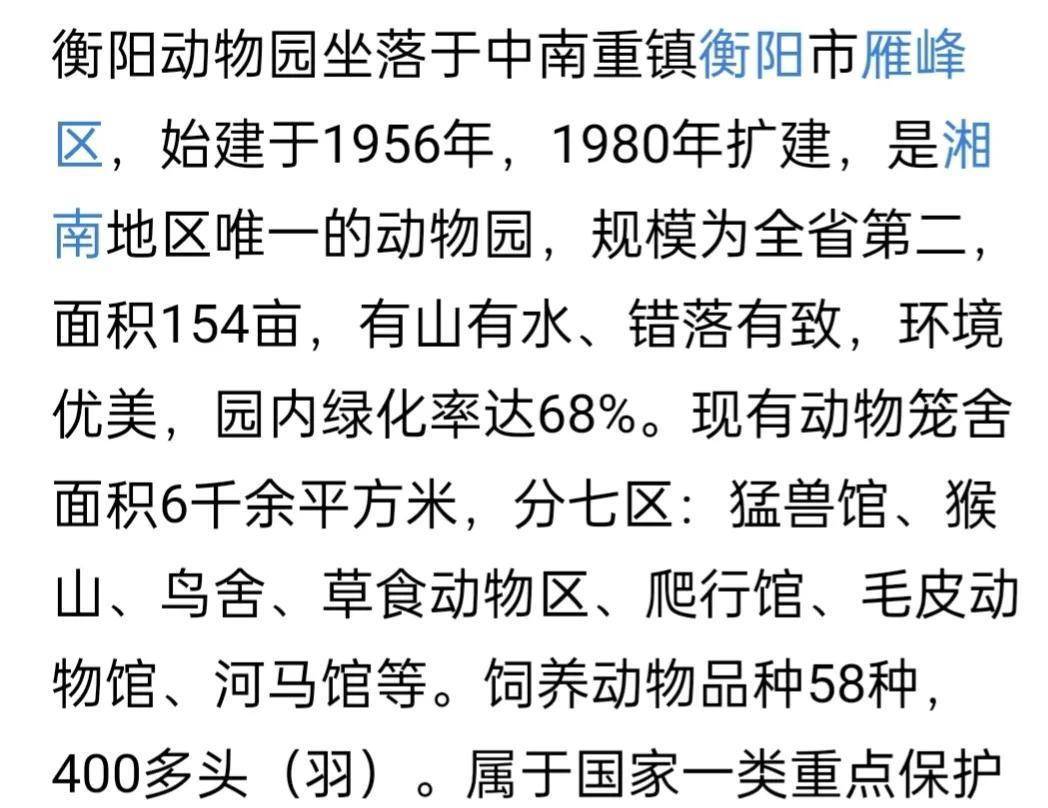 衡阳动物园历史悠久,建园至今已有半个多世纪。还扩充了58种动物,面积154亩。