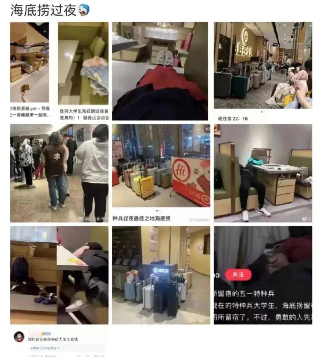 几十个行李箱集中在海底捞的前台,店内散落着熟睡的游客,身上还拎着自己的小毯子。