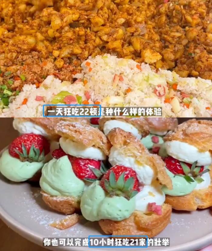 “一天吃23顿饭”,“11小时吃22家餐厅”,最后提到“急性肠胃炎”,一天打点滴。
