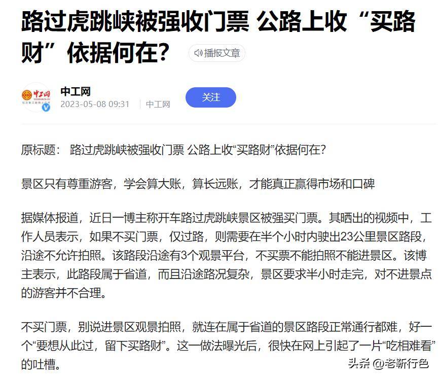 虎跳峡穿越省道的时间有限,有点无语。省道是地方,景区甚至需要过往车辆买景区门票。官方的解释是去省道的路上有个观景台,观景台建在景区。这种情况下,可以让人直接管理观景台,没有门票的不允许靠近。管理省道景区是不对的。还有,限时通关不应该是景区说了算。此时,你的安全意识去哪儿了?
