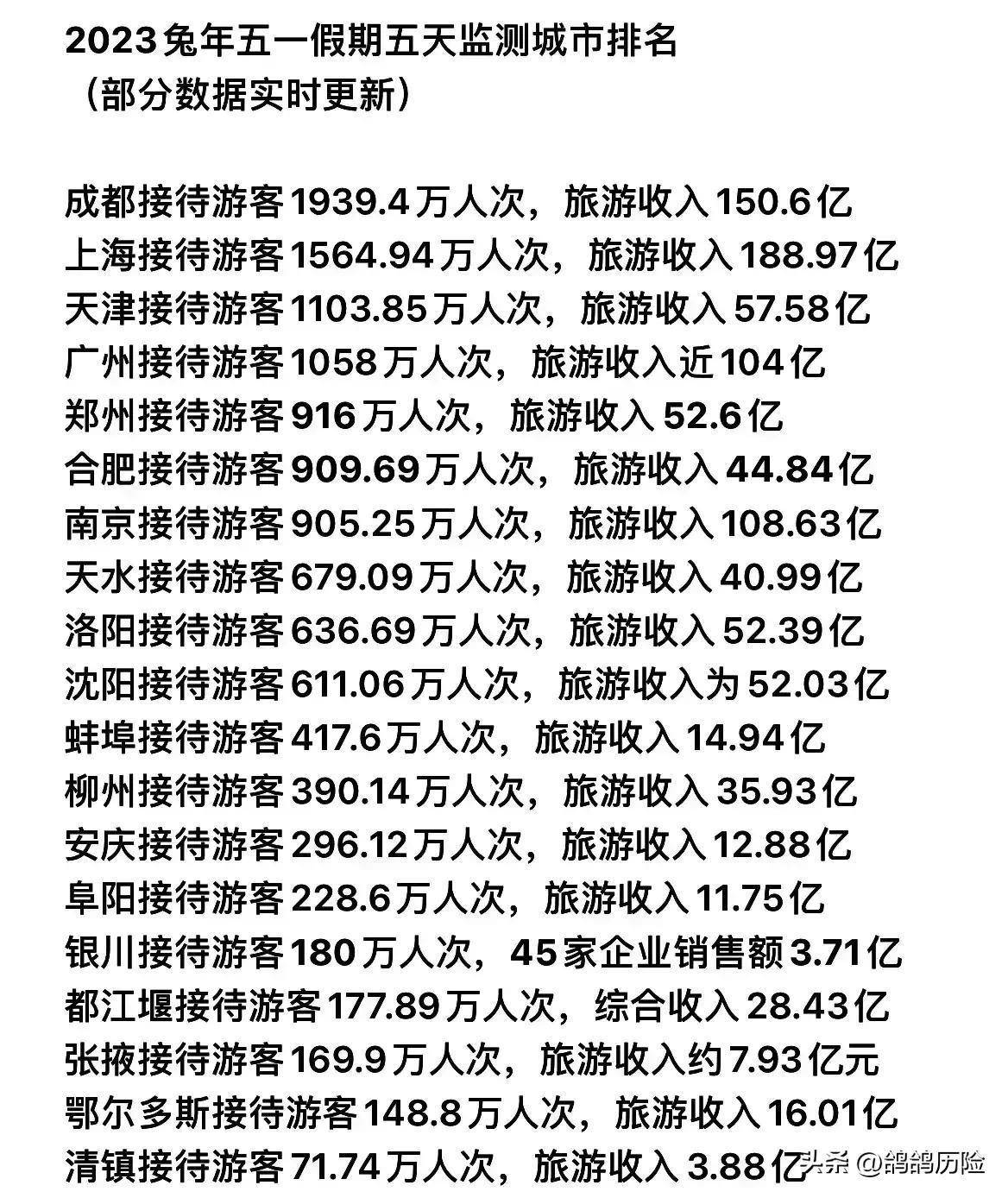 只能比较两个城市A级景区的游客数量,其他城市都没有[泪流满面]。但从全国数据来看,成都人口最多,旅游收入第二。重庆游客人数吃紧,旅游收入吃紧。为什么会这样?与重庆以往的风格不同。也许今年会很艰难。重庆从来就不是旅游城市。希望以后加强旅游建设赶上成都[笑]