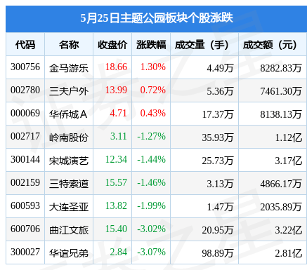 5月25日主题公园板块较上一交易日下跌0.82%,华谊兄弟领跌。当日上证指数报收于3201.26,下跌0.11%。深证成指报收于10896.58,下跌0.22%。主题公园板块个股涨跌见下表: