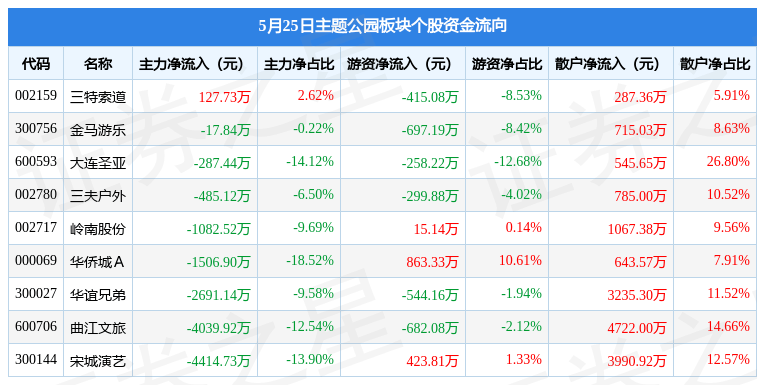 从资金流向上来看,当日主题公园板块主力资金净流出1.44亿元,游资资金净流出1594.32万元,散户资金净流入1.6亿元。主题公园板块个股资金流向见下表:
