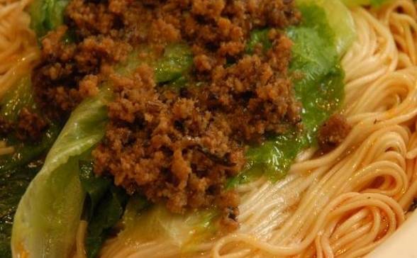 做好的酱油醋汁、芝麻酱、辣酱红油各盛一勺放入碗里,再加适量花椒粉,加入少量开水或汤,做成汤底。细面煮熟盛入放了料汁的碗里。青菜烫熟放在面上,放芽菜肉臊、香葱碎、花生碎即可。炒好面臊,放好调料,就可以开始煮面了。面条煮熟后,捞入已调味的碗中,撒上少许的臊就可以了。面条滑爽,面臊酥香;咸鲜微酸辣,芽菜香味浓郁。