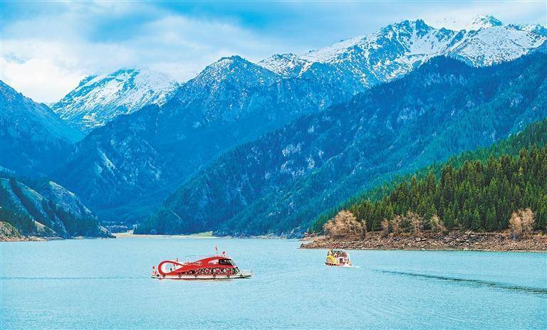 5月22日,新疆昌吉回族自治州天山天池景区,游客乘环保游船,览湖光山色。目前,天山天池景区已全面进入旅游季。 陶维明摄(中经视觉)