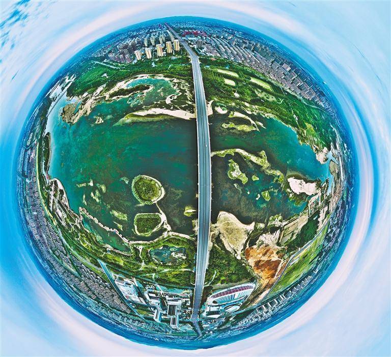 5月24日,空中俯瞰山东日照市莒县沭河国家湿地公园,一江碧水,两岸秀色,展示出“河在城中,城在景中”的生态水韵之美。