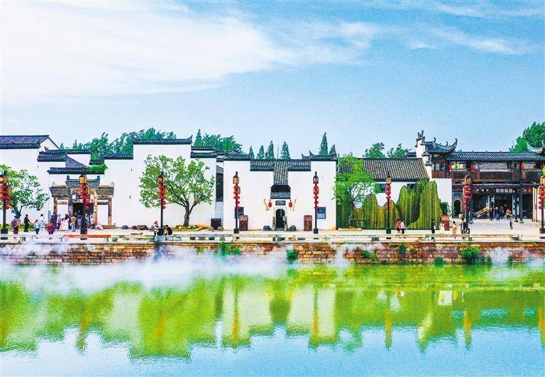 5月19日,安徽铜陵市义安区犁桥水镇旅游区,白墙青瓦的徽派建筑倒映在河面上,显得格外生动。