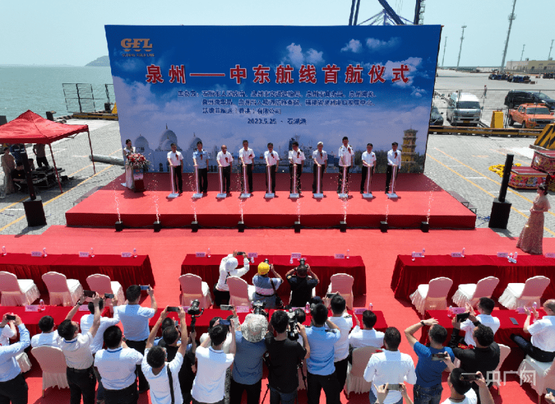 央广网泉州5月26日消息(记者罗晓英 通讯员黄鹏)5月25日,泉州——中东航线在福建省泉州港石狮石湖作业区开通。装载机械设备、发电机组、石材、童鞋、卫浴等泉州本地货物的“星源”轮,在此启航中东迪拜杰贝阿里港。