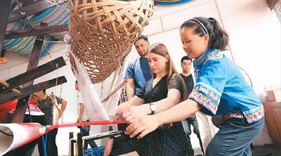 外国游客在广西来宾忻城县织锦基地体验壮锦纺织技艺。