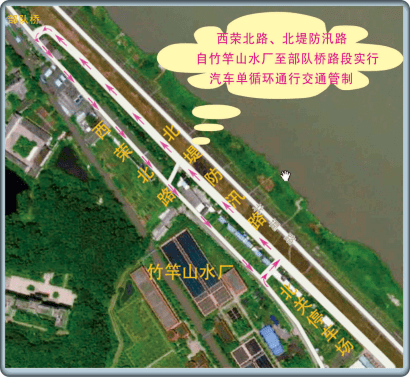 (二)单向通行路段:西荣北路竹竿山水厂前路口禁止汽车直接往北堤方向行驶;报废机动车拆解场前路段只准汽车从江边阿明沙场路口往外环北路驶出,禁止从外环北路报废场路口驶入;北堤路自北关引韩起至龙空沙场路段只准二轮摩托车自南往北单向通行。