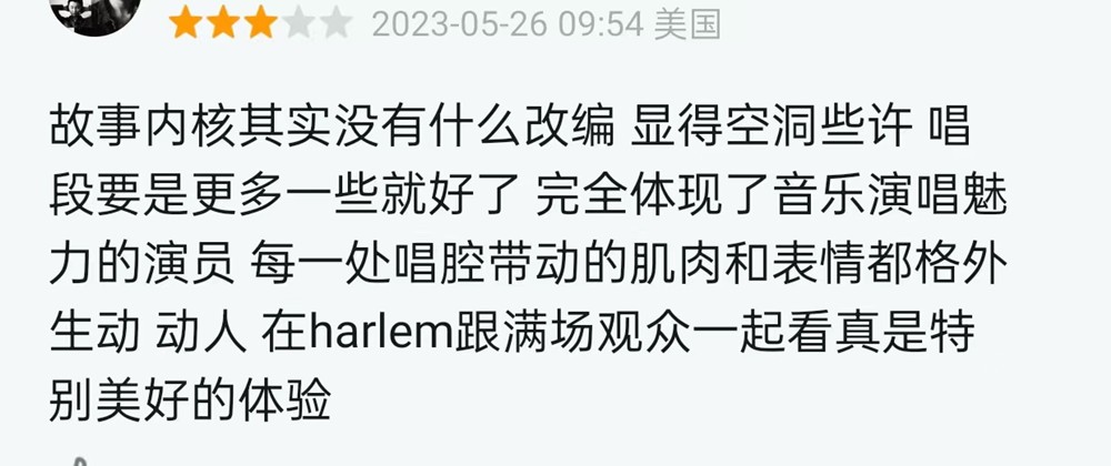 与国外首轮口碑中几乎一边倒的好评不同,即使是领略了海莉.贝利的好歌喉,但国内多数观众还是觉得她虽然表现不差、唱歌好听,但“真的不应该出现在这部电影里”。