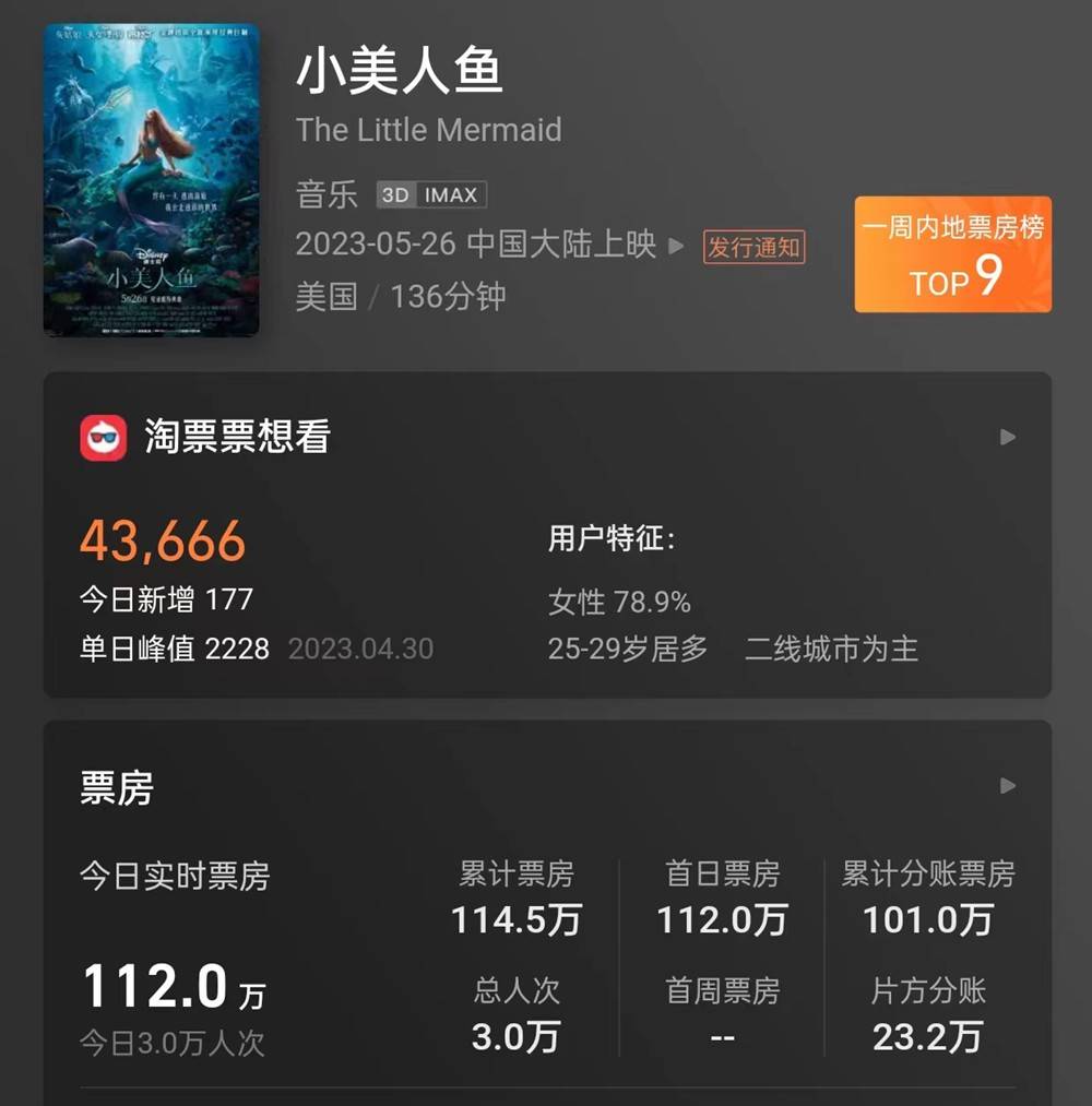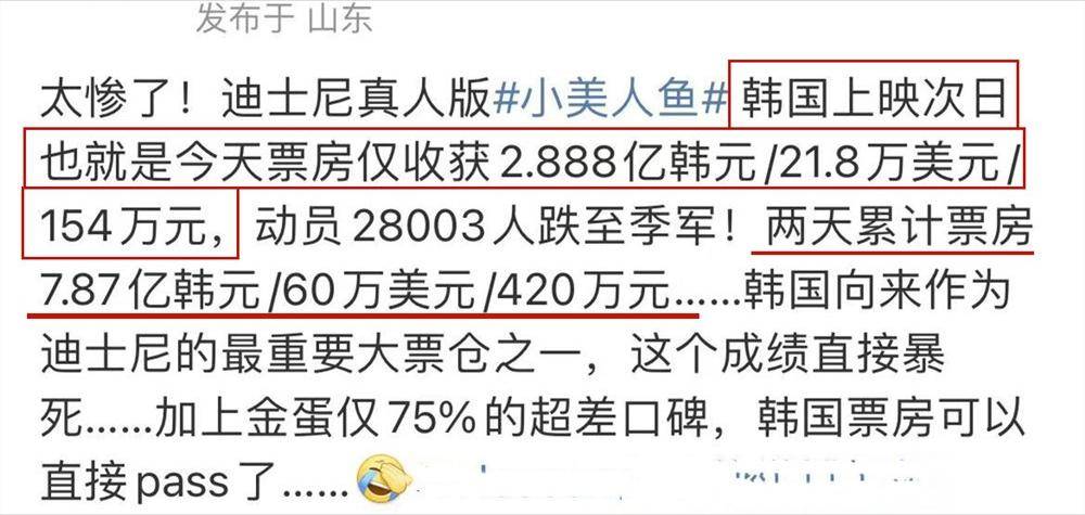 只不过,这些关于真人版《小美人鱼》的好评,并不能对影片的票房形成正面影响。即便是在有“迪士尼最大票仓之一”的韩国,影片票房也只能用“惨”来形容。