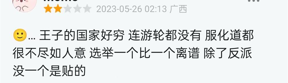 海底王国从头到尾只有几条人鱼,王子的国家穷到连游轮都没有,连过往迪士尼必备的展示女主魅力的长镜也取消了。