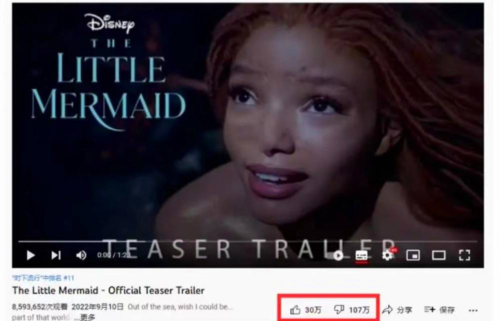 因为选角问题,迪士尼真人版《小美人鱼》一直争议不断。首支预告片放出后,也未能扭转网友的印象,负面评论远超点赞数。