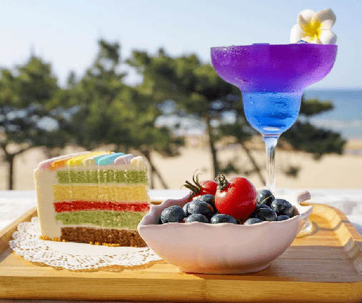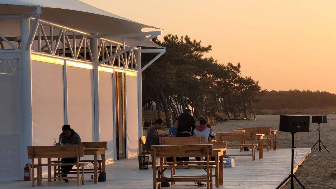 在沙滩上,有一栋洁白的建筑,那就是 亲海音乐餐厅。摩洛哥风格设计,异域风情满满。在这可以享用到烧烤、海鲜等美食,还有奶茶等各种饮品可以享用。