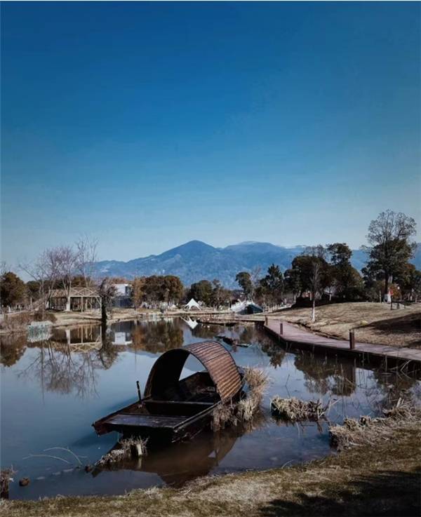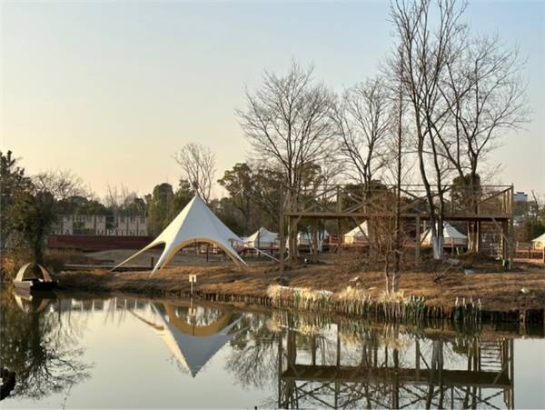 身处春野秋梦星野宿之中,随着前行的脚步,进了春野秋梦星野宿的门之后就到了湖面如镜上的拱桥,将营地景色净收眼前。此时可体验到欧阳修在《丰乐亭游春 其三》中写道的“红树青山日欲斜,长郊草色绿无涯”,在这里青山隐晦,草色青绿。在春野秋梦星野宿这里的每一处都是经过精心设计,创意性帐篷、木质观景台等等的氛围感随处可见,随手一片都是大片级背景,将大自然与现代化带来的艺术与舒适完美融合。