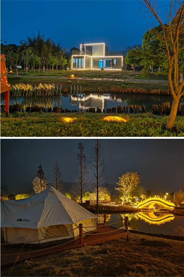 除了优美的环境,在春野秋梦星野宿中的可玩性也很多,烧烤、划船、露天电影、户外音乐一应俱全。夜晚缤纷的灯光亮起,整个营地都变得浪漫起来,各种各样的美妙灯光秀更加璀璨夺目,吃的喝的玩的看的…….每一处都能得到满足!