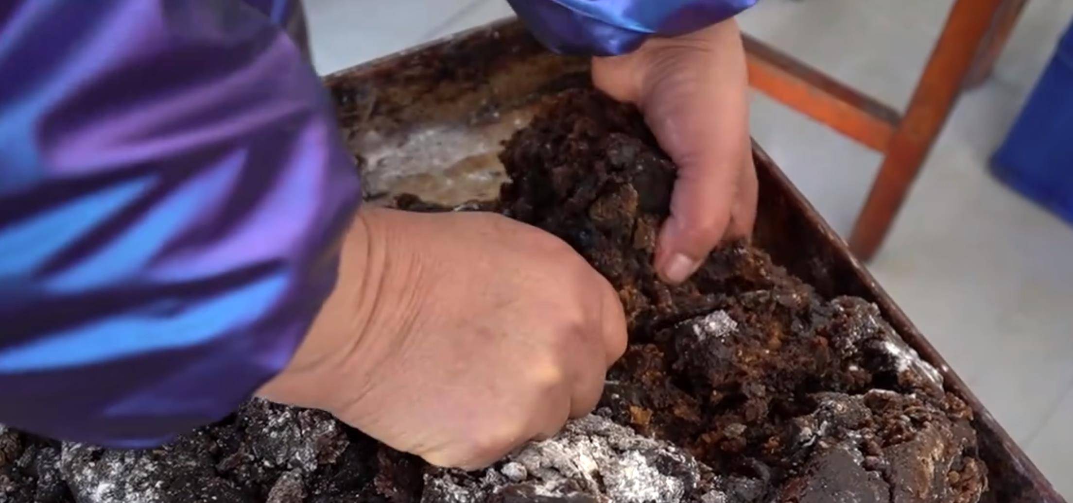 这样和出来的面有一点像油酥面,把面和好以后要放到一边备用,来准备要包的馅,他这个馅是用枣泥儿制成的,大爷说要把新疆大枣蒸熟以后,用手一个一个按下去,这是纯手工制作出来的枣泥,再和油、糖放到锅里熬着,熬好了以后保质期在三年以上,这真的是传统工艺的魅力,里面没有任何的添加剂,但它的保质期非常的长。