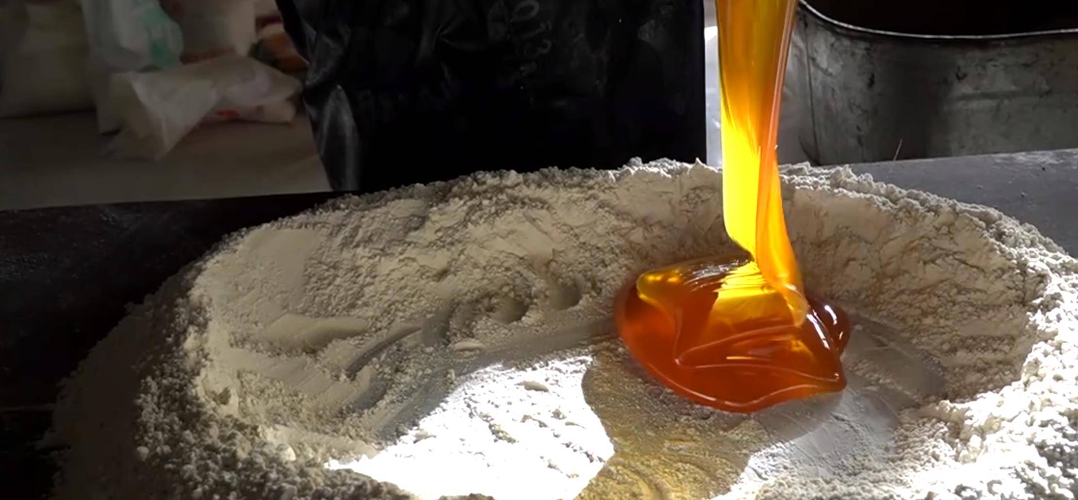 说实在的,虽然这个小吃价格比较便宜很接地气,但它制作起来还是比较麻烦的,首先和面是需要10斤面粉加上5斤饴糖,再加上2斤油2斤水,需要让水、饴糖和油充分融合以后才能够和面搅拌在一起,虽然这个工序能够用机器来替代人工,但是大爷说机器和出来的面比较脆,手工的面很筋道,做出来的小吃在口味上也有着很大的区别。