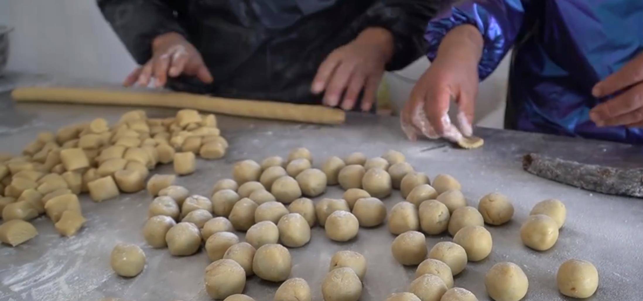 等准备工作都做完以后就可以包了,这个包的过程也能够用蒸包子的机器来代替,但是大爷拒绝了,他说手工包出来的追沙口感非常绵密,用机器做出来的会发硬。所以老两口每天纯手工制作的量不会很大,也就是30斤左右的面粉。