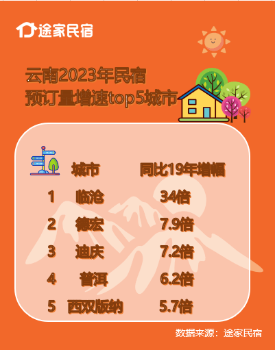 云南民宿的平台预订数据也表现不俗。途家民宿CBO刘杨介绍,今年以来云南民宿预订量排名全国第一,同比2019年增长四成。传统旅游城市持续霸榜,大理成为春节期间预订量全国第一的城市,西双版纳春节预订量增速全国第一。此外,云南还涌现出一批小众目的地,与2019年相比,今年预订量增速最快的城市为临沧、德宏、迪庆、普洱和西双版纳,同比增长超5倍。增速最快的县市为迪庆德钦、普洱澜沧和德宏芒市。