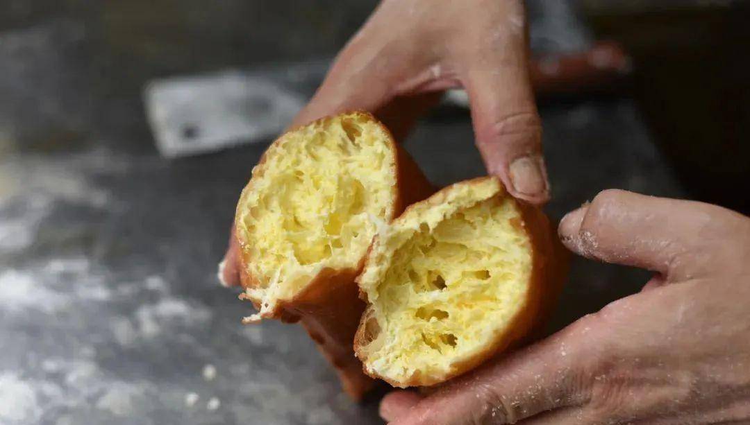 宽宽的面饼炸至两面金黄呈布袋状时捞出,中间戳个窟窿,倒进鸡蛋液,爱吃鸡蛋的可以多加几个,放油锅里复炸。