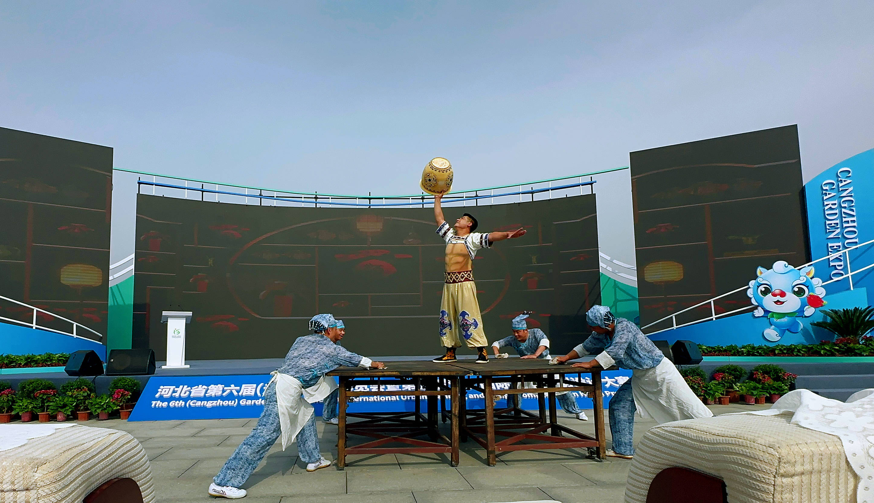 在开幕式非遗文化展演环节,刘吉舞狮、高跷舞蹈、沧州武术、运河船工号子舞剧和《一船明月过沧州》杂技选段等具有沧州特色的文化演出上演。
