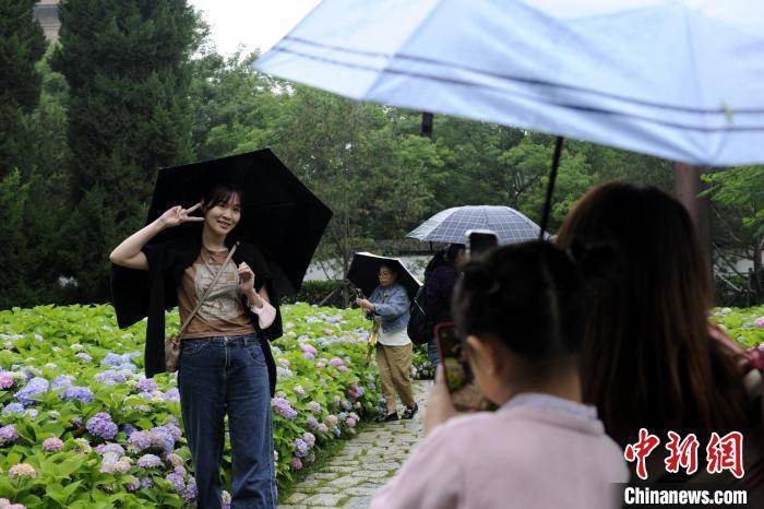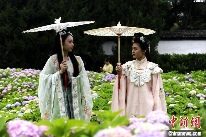 图为身穿汉服的市民拍摄盛开的绣球花。 高铖 摄
