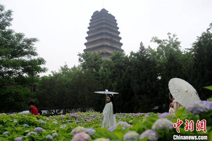 近日,小雁塔下成片的绣球花盛开,色彩缤纷、赏心悦目。古塔与花海相映成趣,吸引众多市民游客驻足观赏、拍照留念。