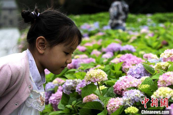 图为孩童观赏绣球花。 高铖 摄