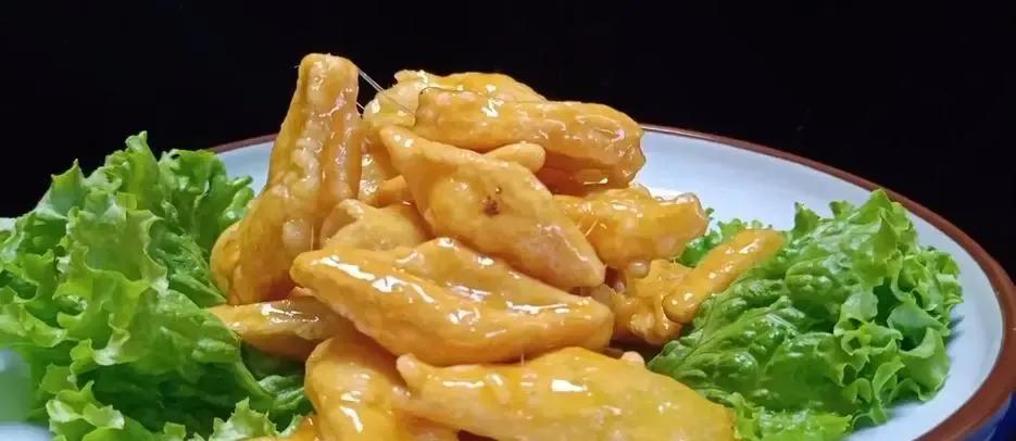 这道与上面不一样,食材一点不贵就四个鸡蛋,将鸡蛋打好与淀粉混合铺成一张张蛋饼切成块下锅油炸,再放上调料即可,说的简单但制作起来十分麻烦估计成本全用在人工上了。