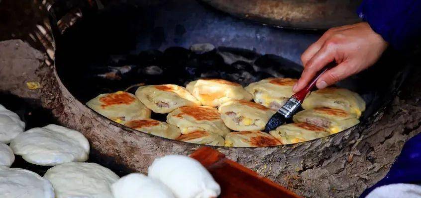 子馍里面馅料丰富,里面有葱花、肉糜,带烧饼在石头上烙至七层熟时,再往里面加个鸡蛋,吃起来喷香。