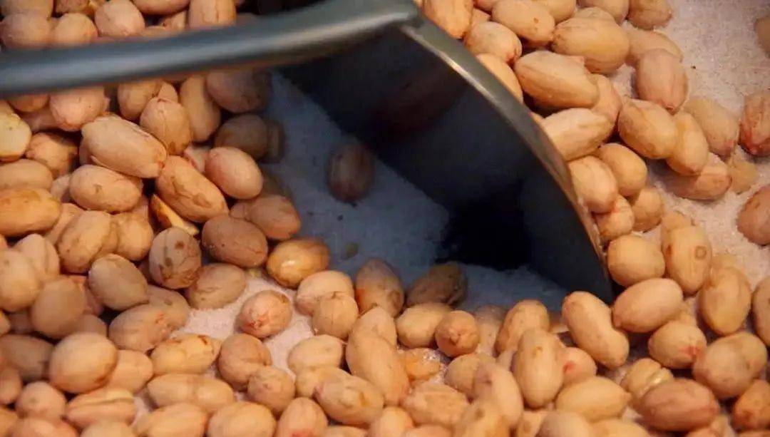 熟后的花生籽,漂浮在热沙中,里熟皮不脱,捞出后晒干就能下酒吃。