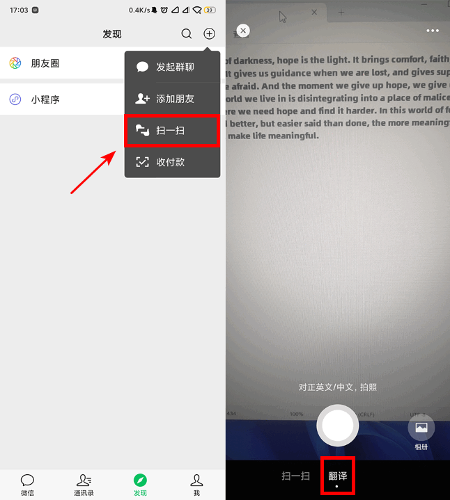 第二步:在扫一扫中找到翻译功能,对准需要翻译的内容拍照即可。
