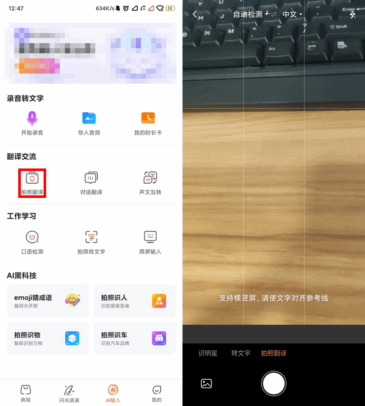 第一步:打开软件后,选择拍照翻译功能,对准你要识别翻译的内容拍照;