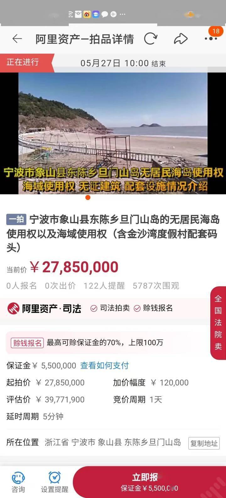 记者根据司法拍卖公告,以及宁波市中级人民法院执行庭提供的有关案件信息,旦门山岛使用权自2018年作为抵押物为工行江北支行与某贸易公司间的贷款提供抵押担保,因贸易公司无力归还借款,相关贷款产生逾期。工行江北支行依法诉至宁波市中级人民法院并申请强制执行,该院对该无居民海岛使用权进行了查封和评估并裁定进行拍卖。