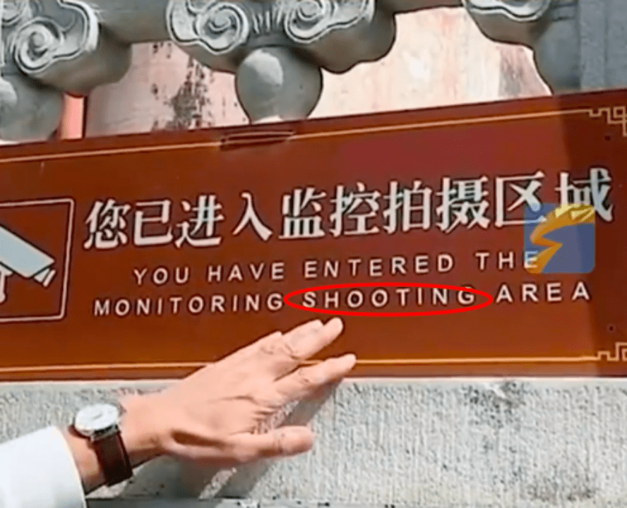 俞敏洪说,“这个地方犯了一个多词的错误,You have entered the monitoring area 就可以了,Shooting就不要了。”要不然就会把“监控拍摄”翻译成“监控射击”。