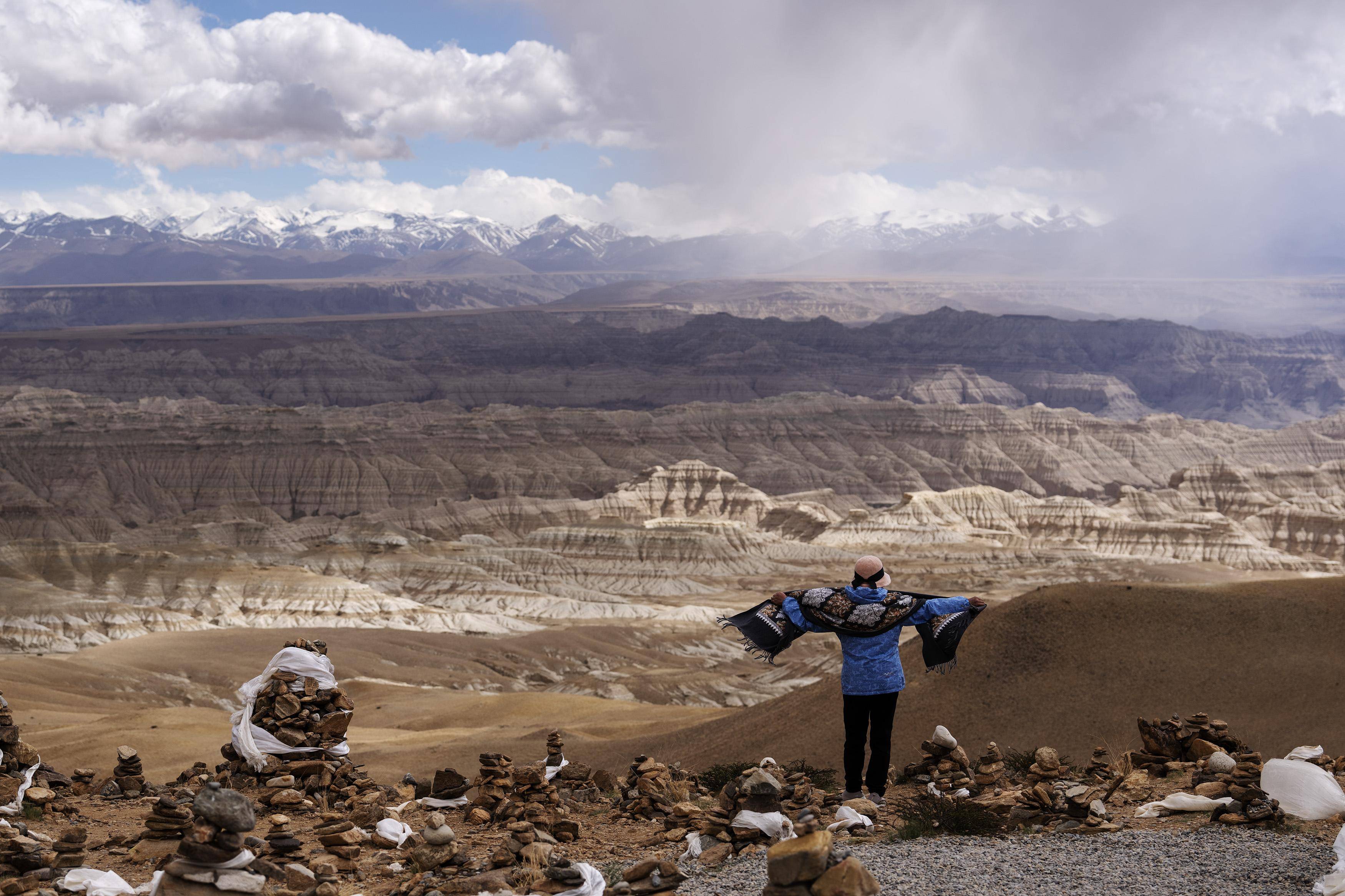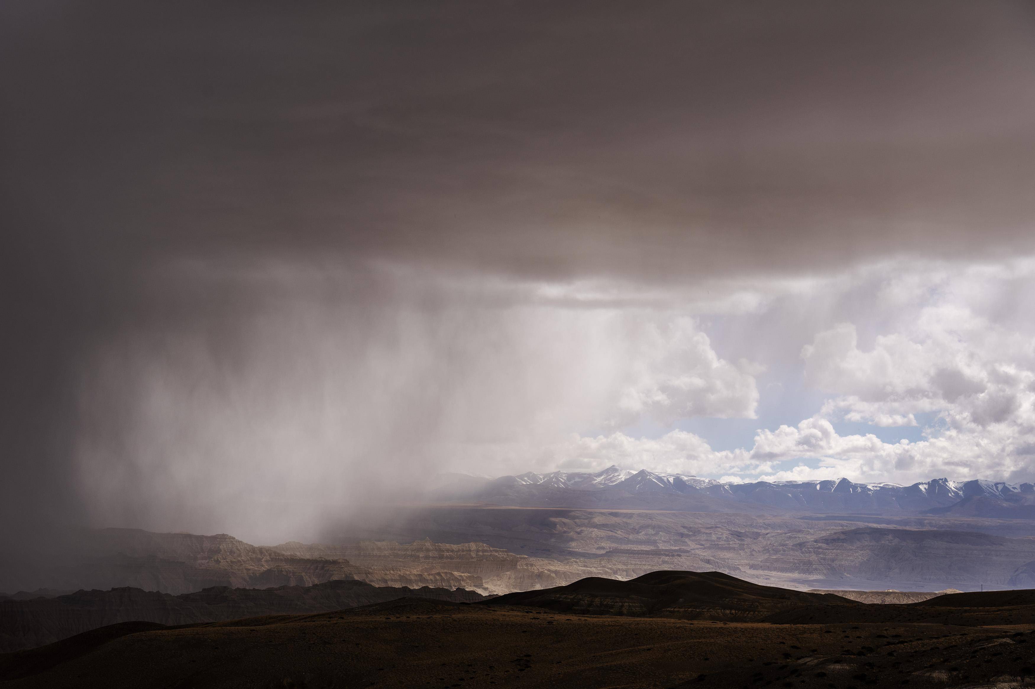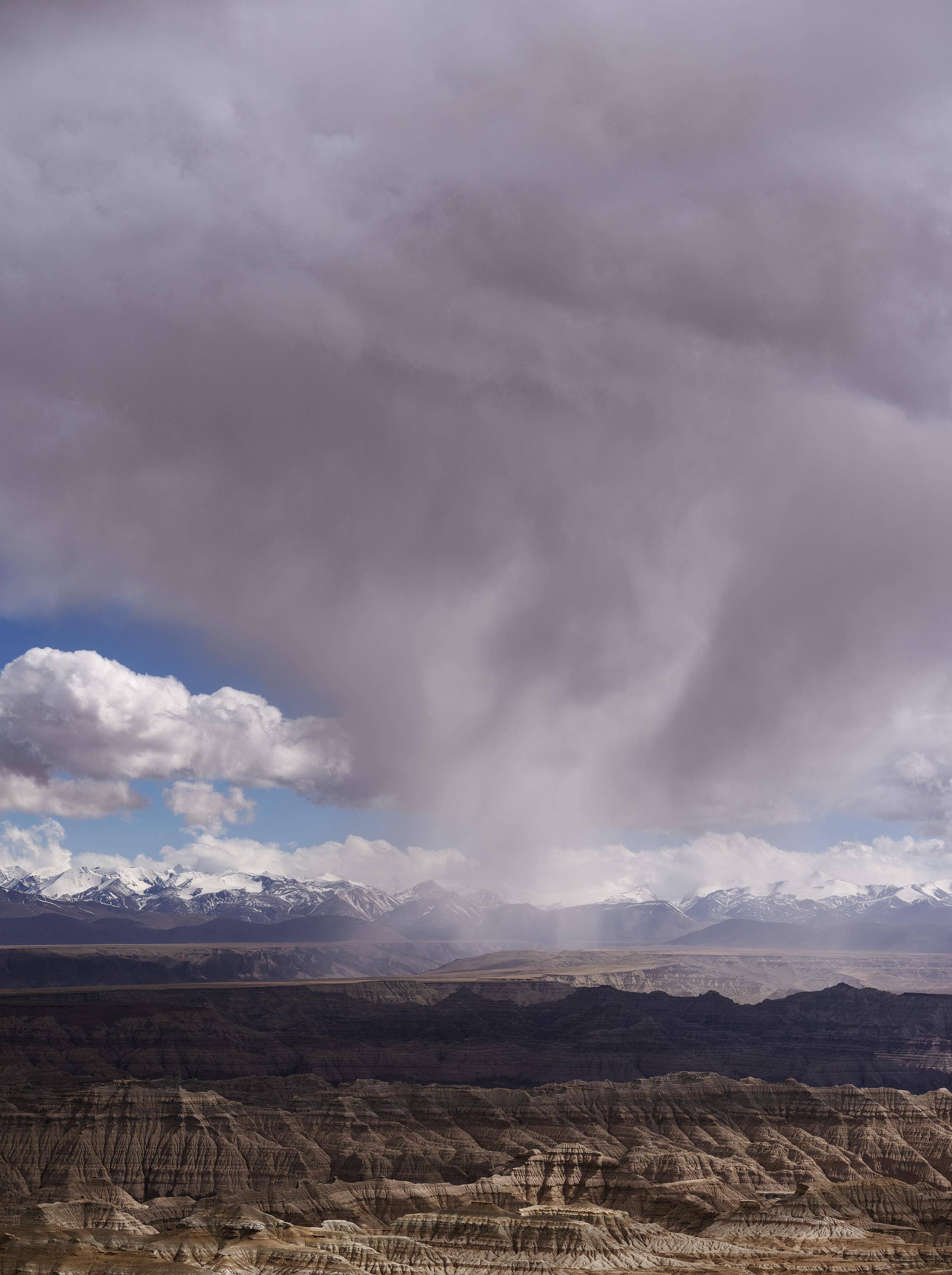 ↑一片雨云飘到札达土林上空(5月25日摄)。