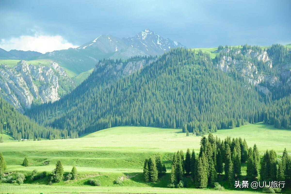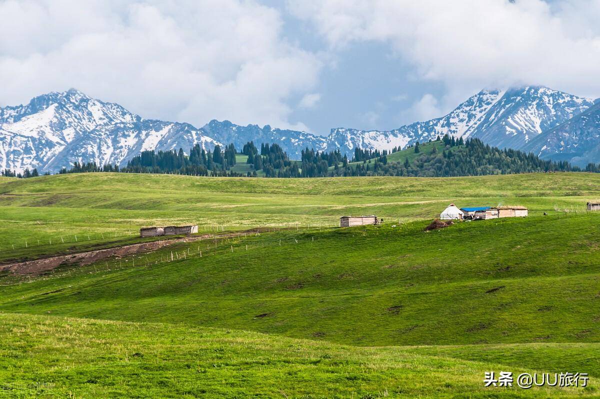 琼库什台的草原草原是立体的山地草原,并不是一望无际的平坦草原。山脚的位置有河流,山腰的位置有木屋和牛羊群,再往上是遮天蔽日的森林和终年积雪覆盖的雪山。不像是旅游景点,更像是走进了油画里,是此生必去的草原。