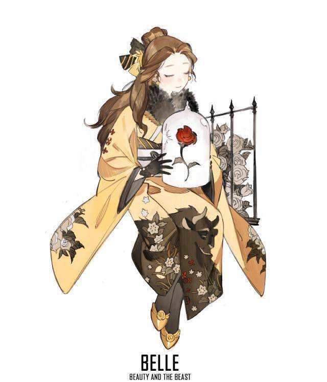 《美女与野兽》中的贝儿公主,和服的设计采用的是和公主同样个暖黄色,配上黑色的花纹以及围脖作为装饰,让贝儿看起来更加温柔大气。贝儿原本就是一位书生气满满的知性公主,如今穿上和服后依然是一副悠然自得的样子。看到她这手捧玫瑰玻璃小灯笼,闭目养神间不经意露出的一抹微笑,真是太过温柔而惬意,满满心动的感觉!