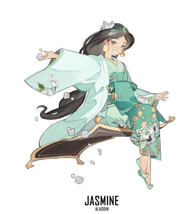 对于《阿拉丁》中的茉莉公主来说,同样是绿色系的和服的打扮,穿在身上后却显得比爱丽儿公主更为成熟!也许是因为茉莉原本皮肤比较黝黑的缘故,淡绿色的和服反而让皮肤显得更黑,所以看起来年龄比较大,不过,当看到茉莉这坐在魔毯上谈笑风生的美丽模样时,还是特别招人喜欢。