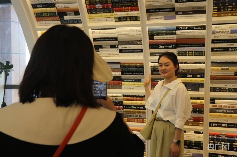 看过了音乐喷泉、帐篷营地等人文景点,采访团成员们发现了一个宝藏书店。步入其间,可以发现整体书店很网红,很有设计感。它的名字叫“未来空间·未时图书馆”。