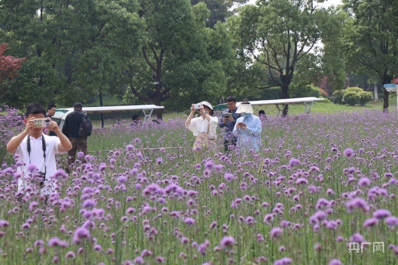 采访团成员步入九龙湖公园可见花海如潮,各色花卉恣意绽放。沿着道路行走,徜徉在绿荫里,满目清新繁盛的绿意也能带给人一份好心情。