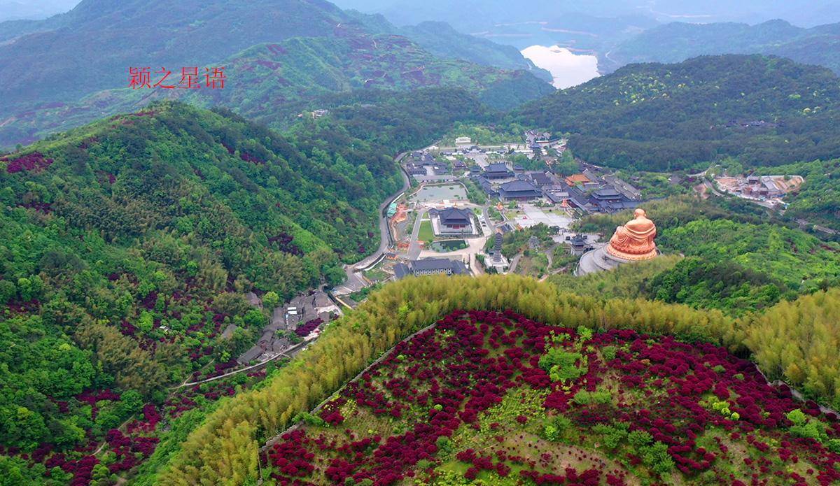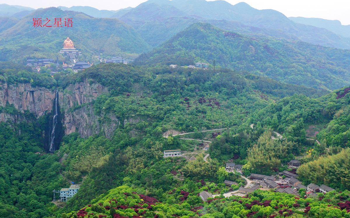 从村后山上远眺雪窦寺,妙高台、千丈岩瀑布、弥勒佛完全呈现在同一幅画中,堪称一幅完美的山水画。