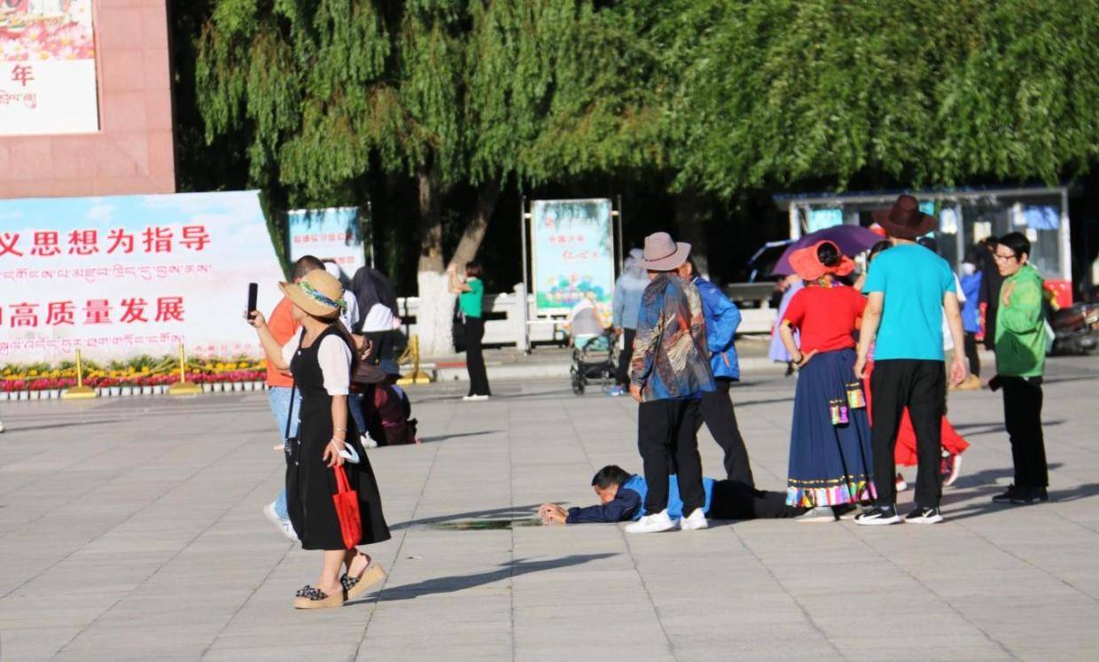 广场上常常可见趴在地上聚精会神拍着照片的游客,边上也不乏指手画脚说三道四的出主意观众,其实都是一些游客在广场的花岗岩地面倒上一滩水,希望能拍个倒影中的布达拉宫,这是个技术活,大多都无法达到心中的愿景,我们也不免俗,记录一下水中布达拉宫的倩影。