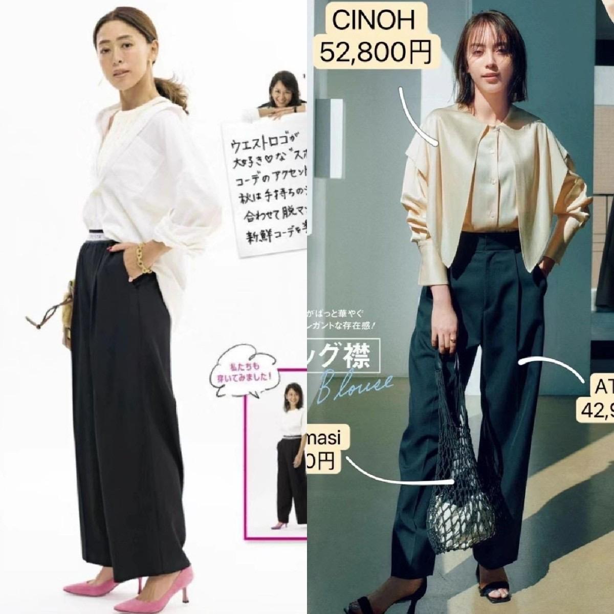 但如果你是有小肚腩的身材,或者是大腿看起来比较粗,就建议选择H版型的长裙和长裤搭配,这种H型+H型的搭配既有宽窄对比,又不会阻碍延展感的产生。