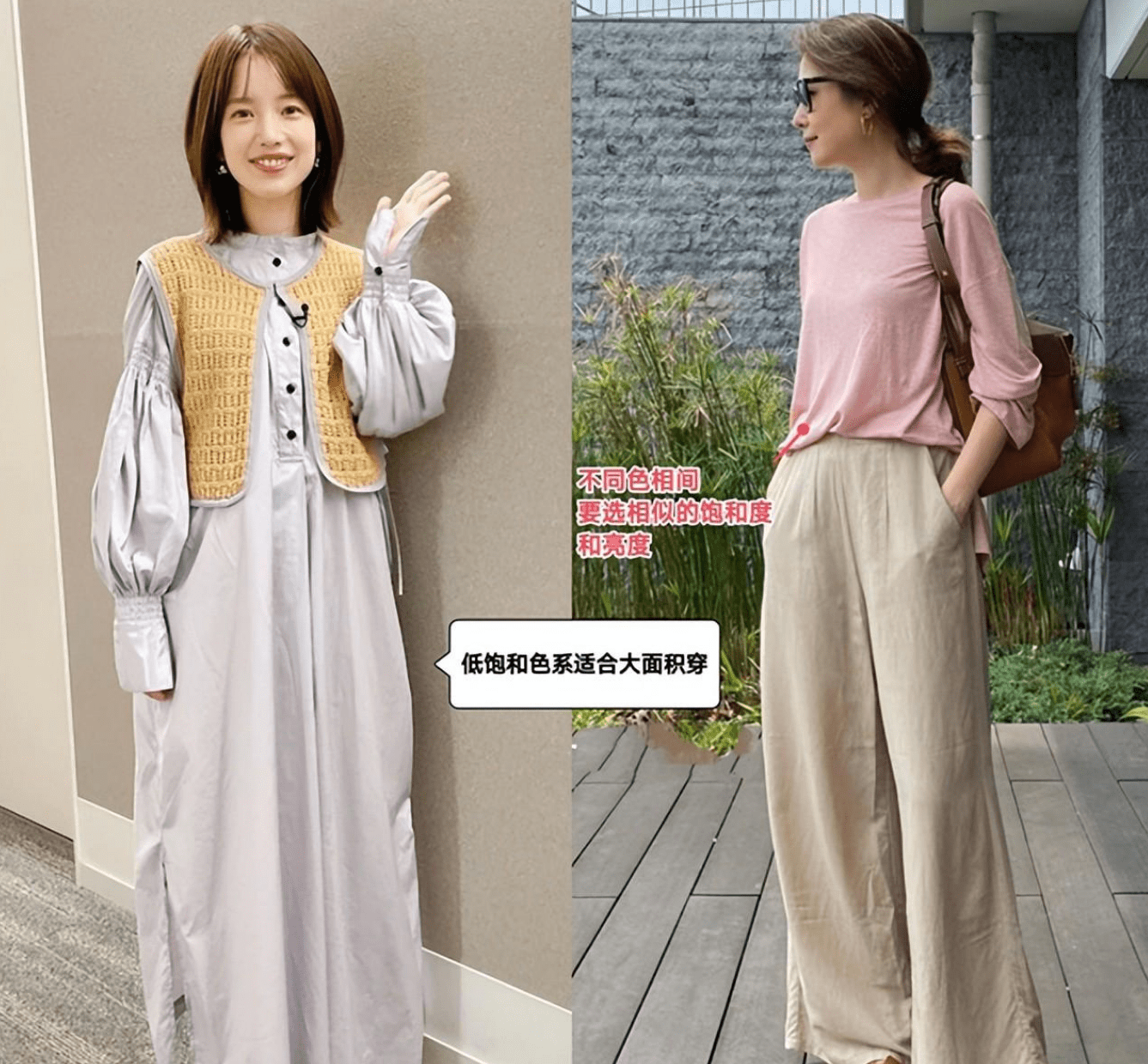如果全身都是色彩的话,这样的穿搭只会给人一种浮夸而累赘的俗气质感,懂得运用较少的颜色,减少大红大绿等高饱和度色彩的使用,这样的穿搭更令人有气质。尤其是对于50岁的女人而言,减少高饱和度色彩,更能够穿出一身清雅通透的气质,给人优质感。